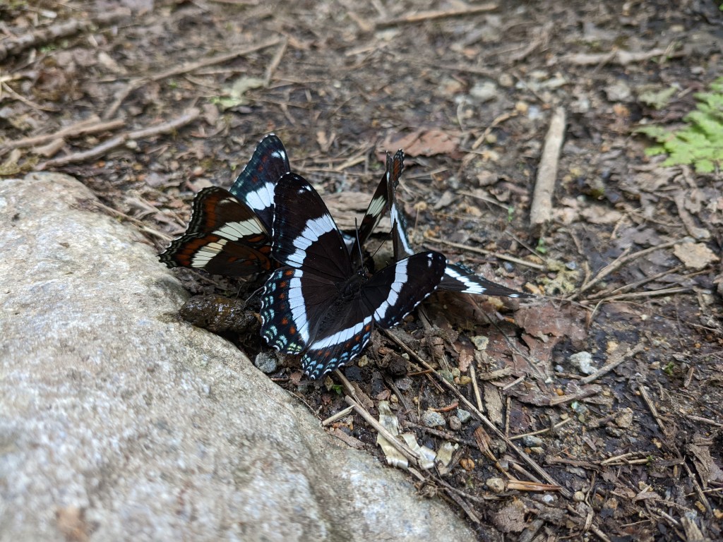 I spent a couple of weeks with friends and family, then headed to the Adirondacks to camp with old friends from college. I got there early and hiked Indian Head by myself, in a hurry not to get caught in impending bad weather. There were white admiral butterflies huddled in little groups all over the place. Maybe they were telling secrets. Probably they were feeding on deer shit. (They get their sustenance from poop rather than plants, like most other butterflies.)