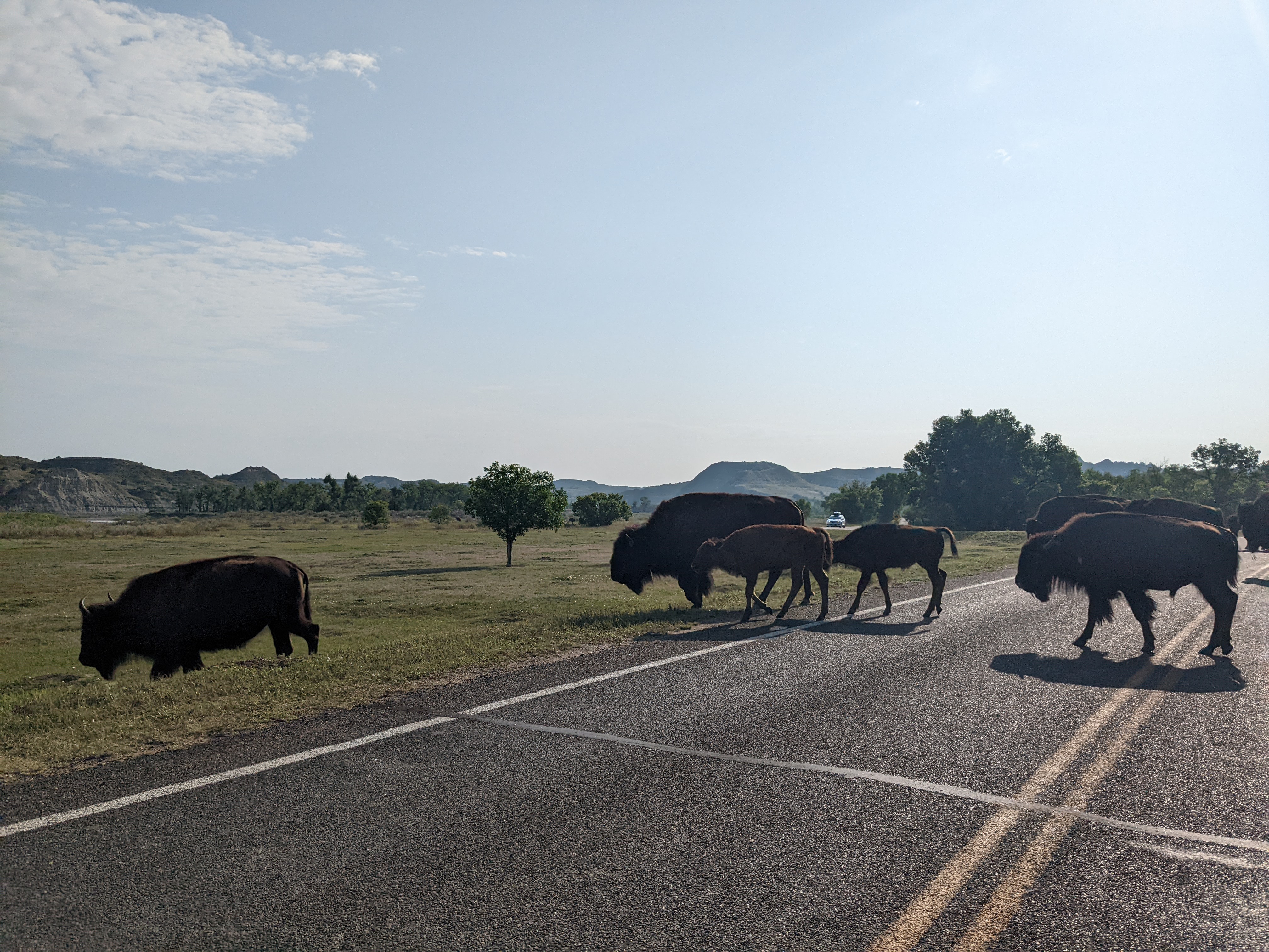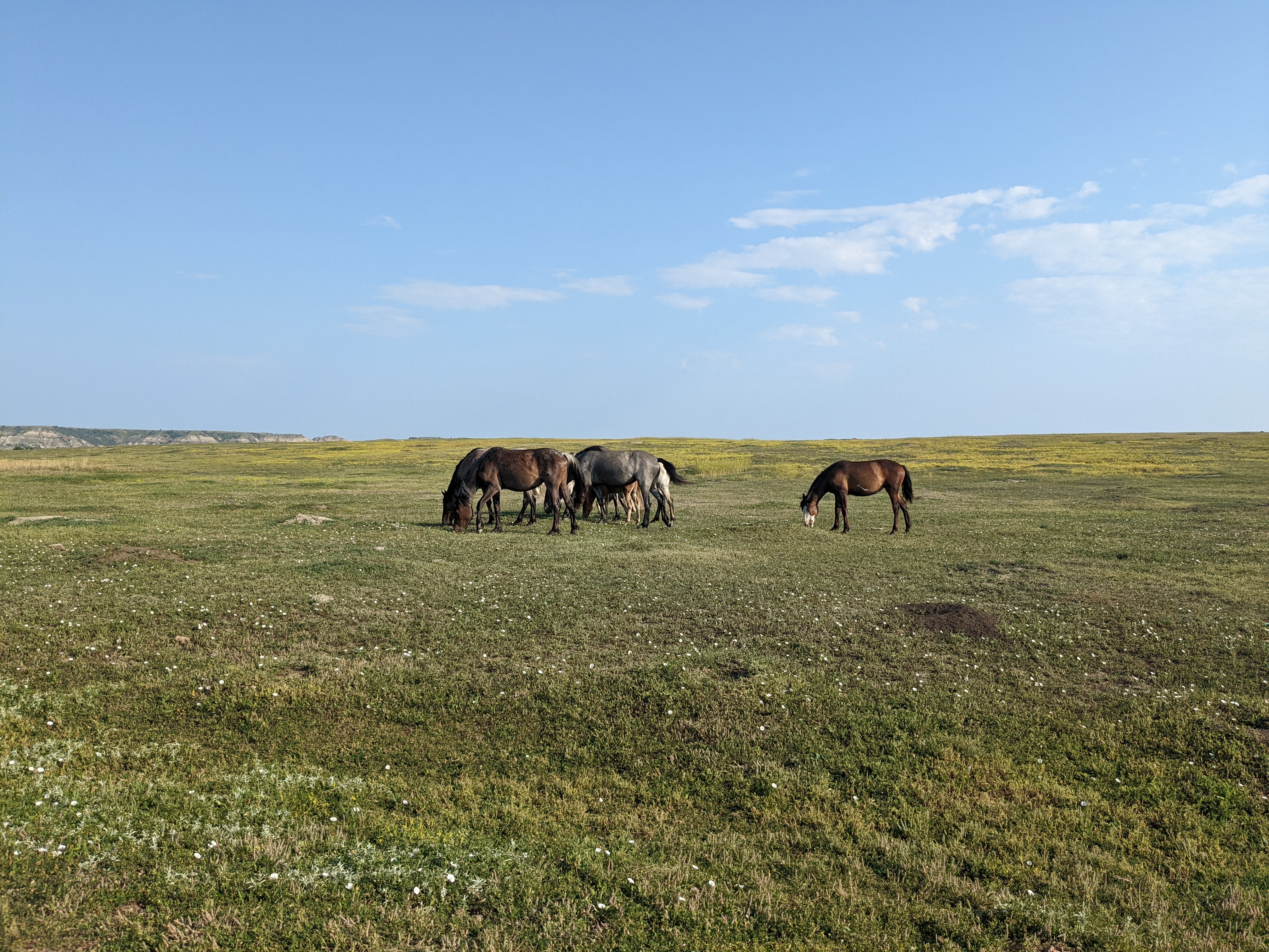 I LOVE this park. There are buffalo and feral horses everywhere, and prairie dogs. Supposedly there are snakes, but I didn’t get to see any. There just really aren’t that many people here, and even fewer get out to hike so I pretty much had the run of the place. I did an 11-mile walk through the middle of the park and saw mostly grass and sun. No people. Two buffalo. (I tried to give them some space and climbed down and up a little ravine, walking straight through a huge spider web in the process. Had to remind myself that I do, in fact, enjoy nature.)