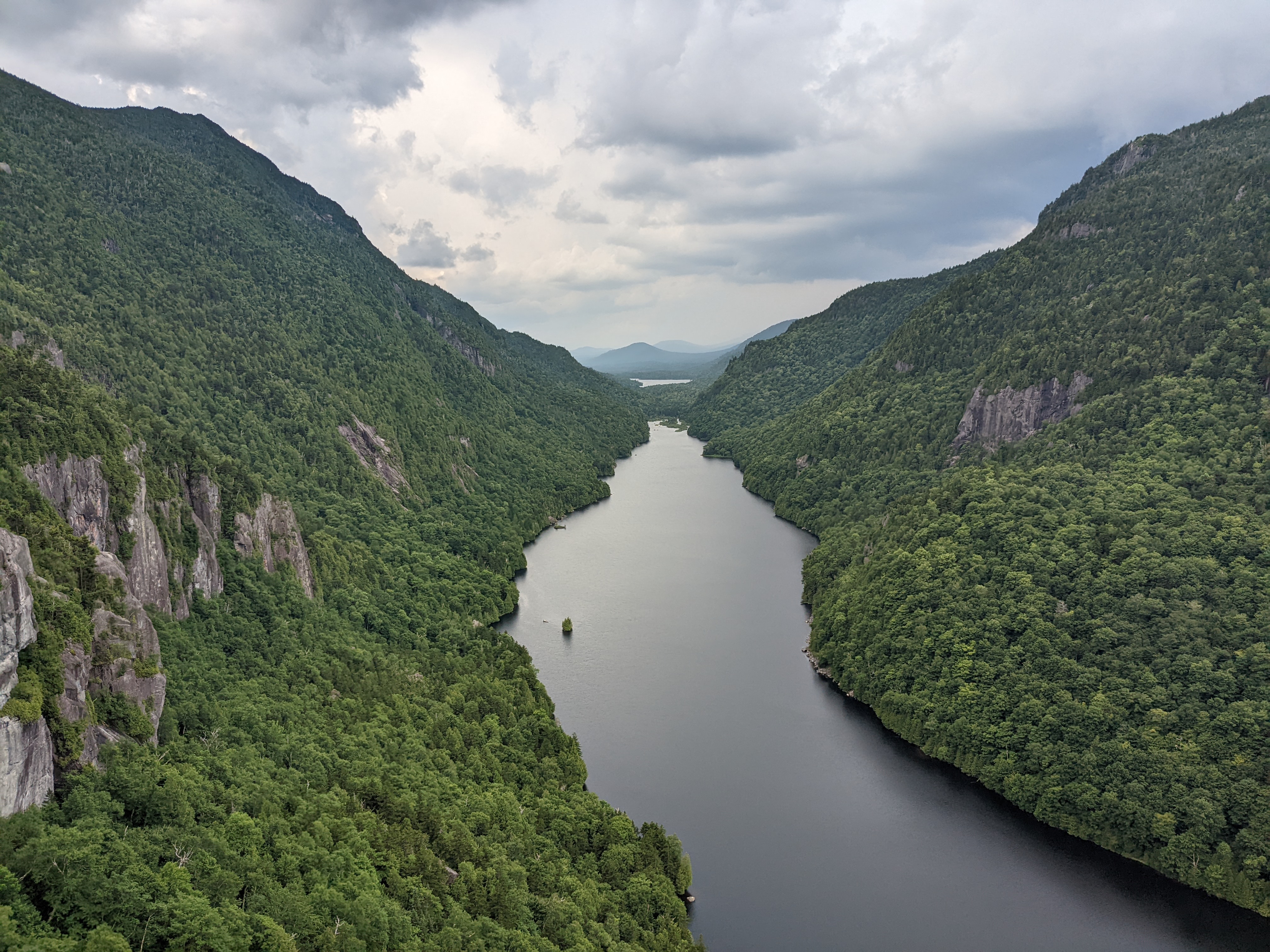 I did get caught in a wicked thunderstorm, but I got off the mountain quickly. I had time before the rain opened up to have a sandwich on the south lookout over Lower Ausable Lake, with Colvin to the left and Sawteeth to the right.